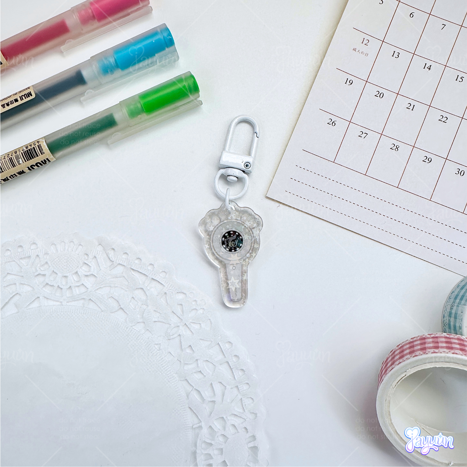 All acrylic keychains and pins have a protective film on both sides - be sure to peel them off!